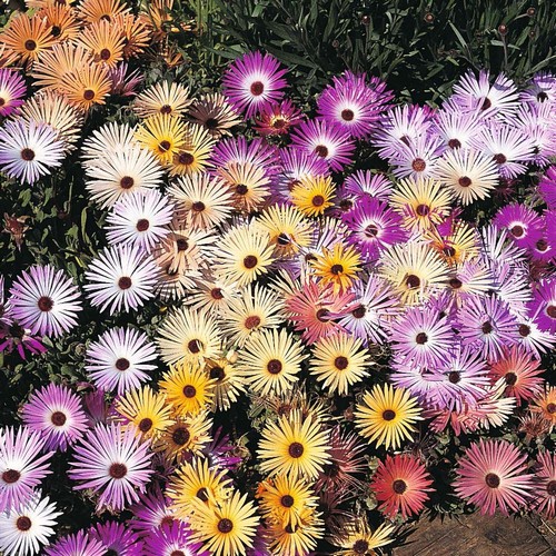 Mesembryanthemum Magic Carpet is a very pretty variety, that produces masses of vibrant daisy-like flowers in a range of lovely bright colours including Purple, Lilac, Red, Pink, Yellow, Magenta, Salmon and Orange.   The flowers have a Dark Red / Orange Eye.  Very free flowering and great for rockeries and the front of borders.  A compact variety, that grows to a height of just 15cm.